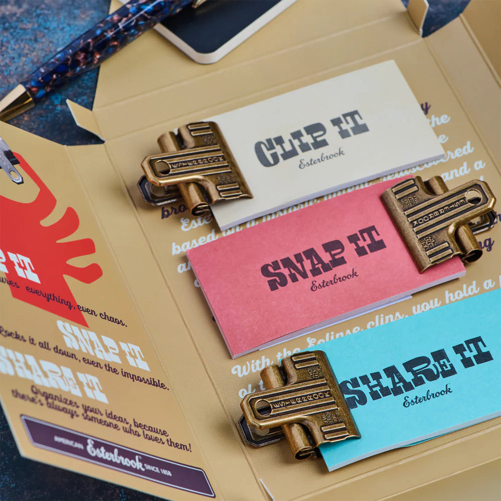 Meet Eclipse – the newest accessory from Esterbrook, reimagined from our archives of the early 1900s. These vintage-style page clips are modeled after original Esterbrook paper holders, crafted with a ball-bearing hinge and fine engravings, including the original patent number.