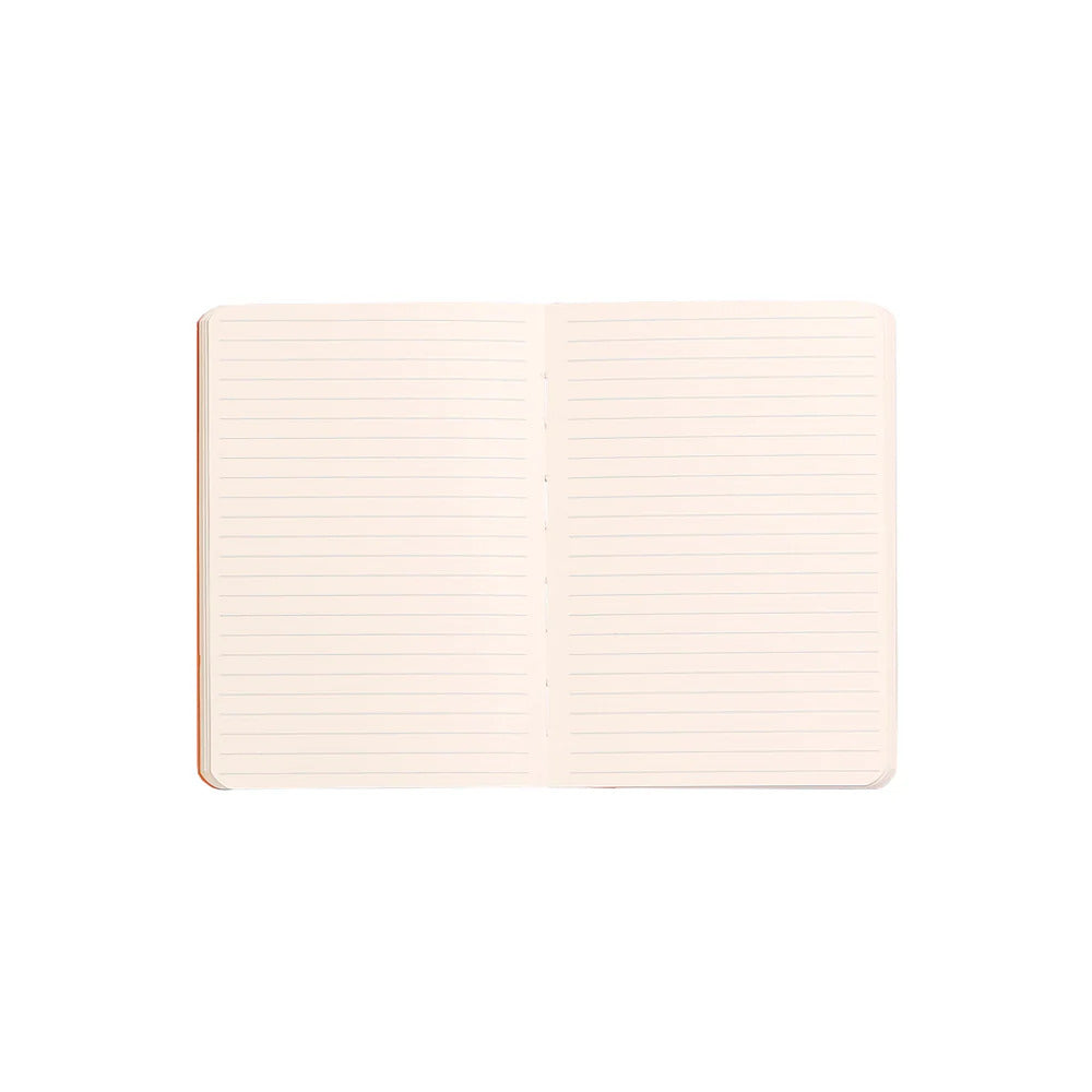 FEATURES: Expanding inner pocket and front and back pages, glued spine, embossed logo, orange elastic closure, 90gsm ivory brushed vellum paper, orange ribbon bookmark.