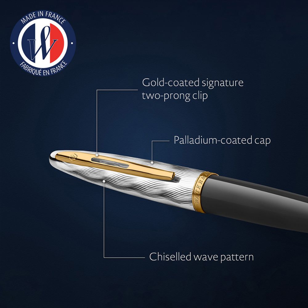 The Waterman Carène's black lacquer barrel and gold-coated trims encapsulate the romantic mood of a Parisian night sky over the golden glow of the city's cafes and streetlights, whilst the exquisite, Palladium-coated cap with chiselled wave pattern perfectly captures the spirit of the undulating waves of the gently-flowing Seine.