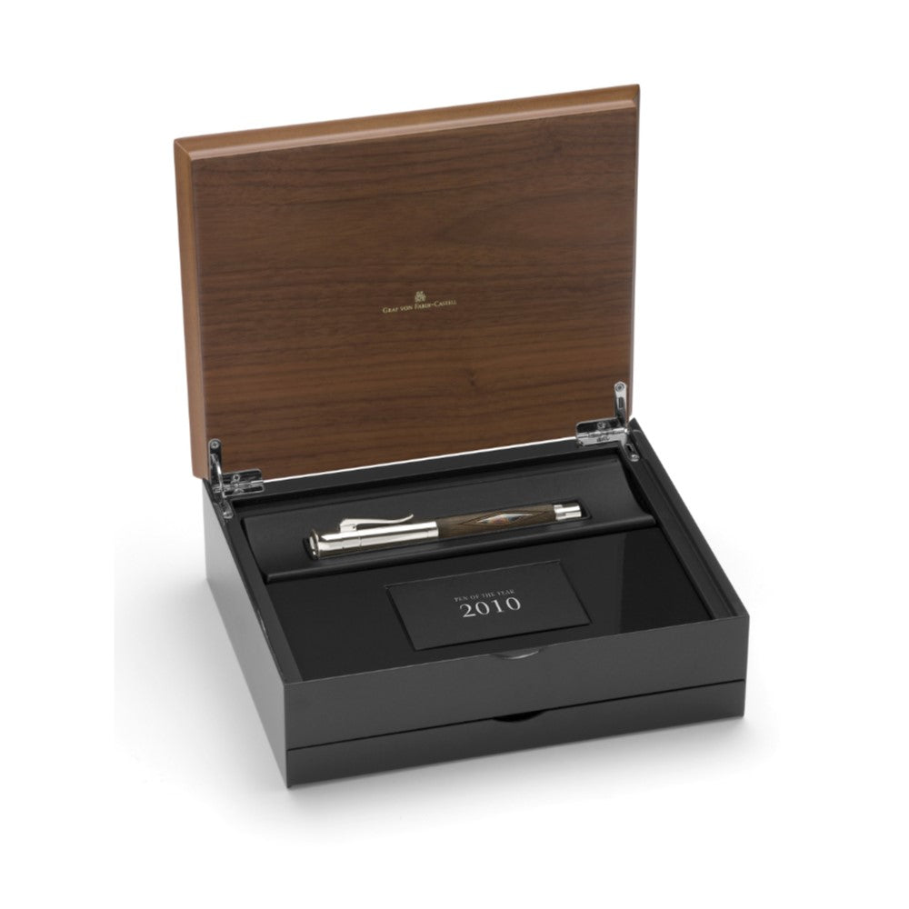 Inspired by valuable historic hunting rifles, the Pen of the Year 2010 combines the craftsman’s secret art of case hardening, engravings and gold inlays with beautiful Caucasian walnut wood. Platinum-plated metal parts and an 18-karat bicolour gold nib, carefully ‘run in’ by hand, round off this numbered edition.